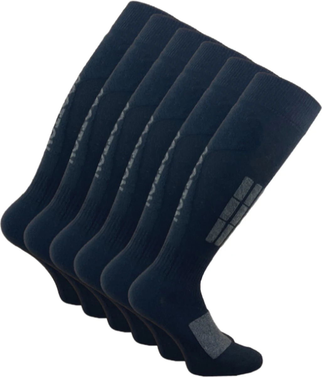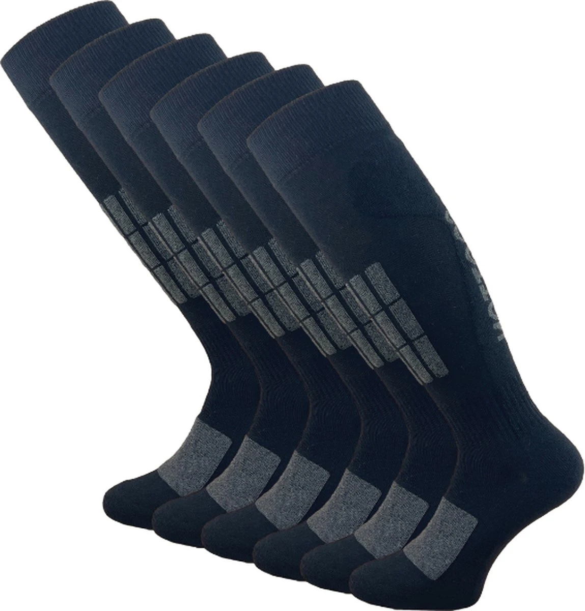 6 paar hoge kwaliteit skisokken met badstofvoering in de kleur zwart. Deze skisokken zijn gemaakt van een zachte katoenmix. Hierdoor zijn de skisokken ademend, anti-transpirerend, zacht en comfortabel voor de huid. Deze skisokken houden je voeten warm en droog, zelfs tijdens het skiën of snowboarden, zodat je je geen zorgen hoeft te maken dat je voeten koud worden. Dankzij de badstofvoering aan de binnenkant van de sok zorgt het voor extra demping waardoor de drukpunten worden verminderd. De extra badstofvulling zit in de wreef, voetbed, kuit en scheen. Hierdoor bieden deze skisokken extra bescherming en voelen de sokken extra warm en zacht aan. Deze wintersokken voor zowel dames als heren zijn niet alleen geschikt voor skiën of snowboarden, ze kunnen ook worden gebruikt voor verschillende buitenactiviteiten. Zoals hardlopen, fietsen of wandelen. De sokken zijn voorzien van handige maataanduiding. Ideaal voor na het wassen, zodat de skisokken gemakkelijk op maat kunnen worden gesorteerd. Deze wintersportsokken van Sqotton zijn de ideale skisokken voor op wintersport. De skisokken zijn in diverse maten verkrijgbaar en worden geleverd in een voordeelverpakking van 6 paar.